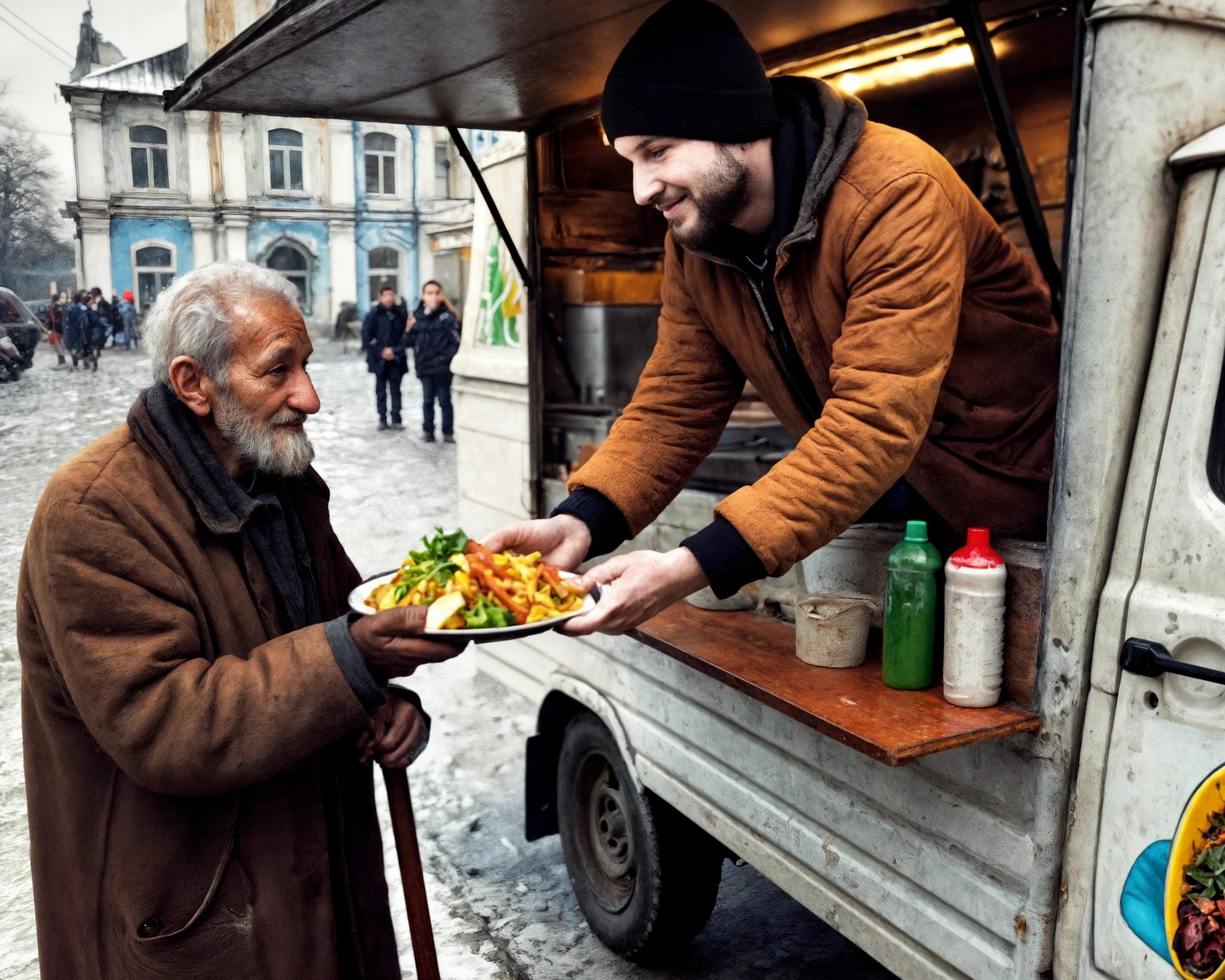Quelques instants plus tard, Mikhaïl sortit du camion avec deux bols de soupe chaude. Il les posa délicatement devant le couple et sourit gentiment.