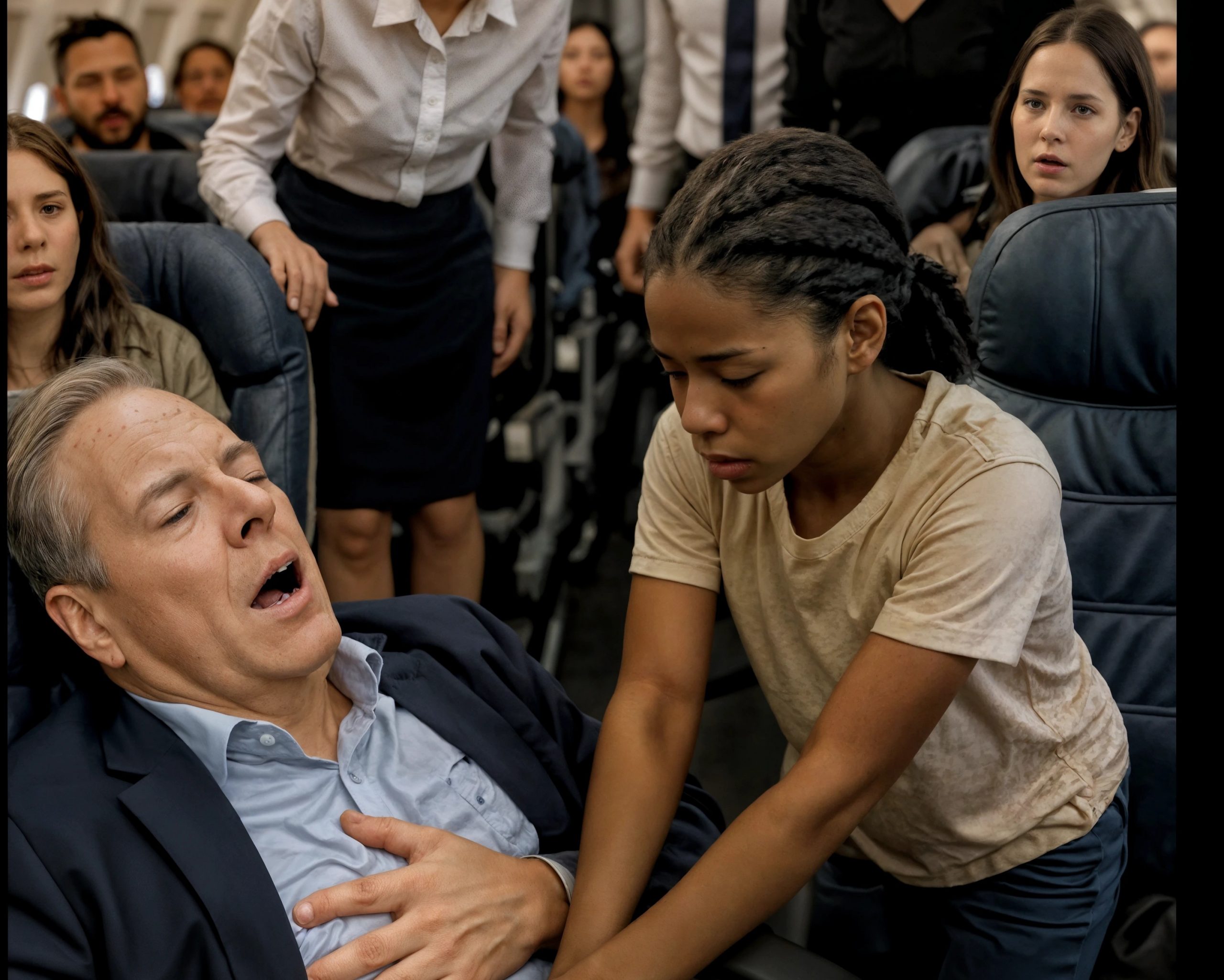 Elle enchaîna compressions et insufflations. De longues secondes s’étirèrent… puis la poitrine de Victor se souleva. Il respira. Un souffle de soulagement traversa l’avion, suivi d’applaudissements. Maya, tremblante, regagna son siège.