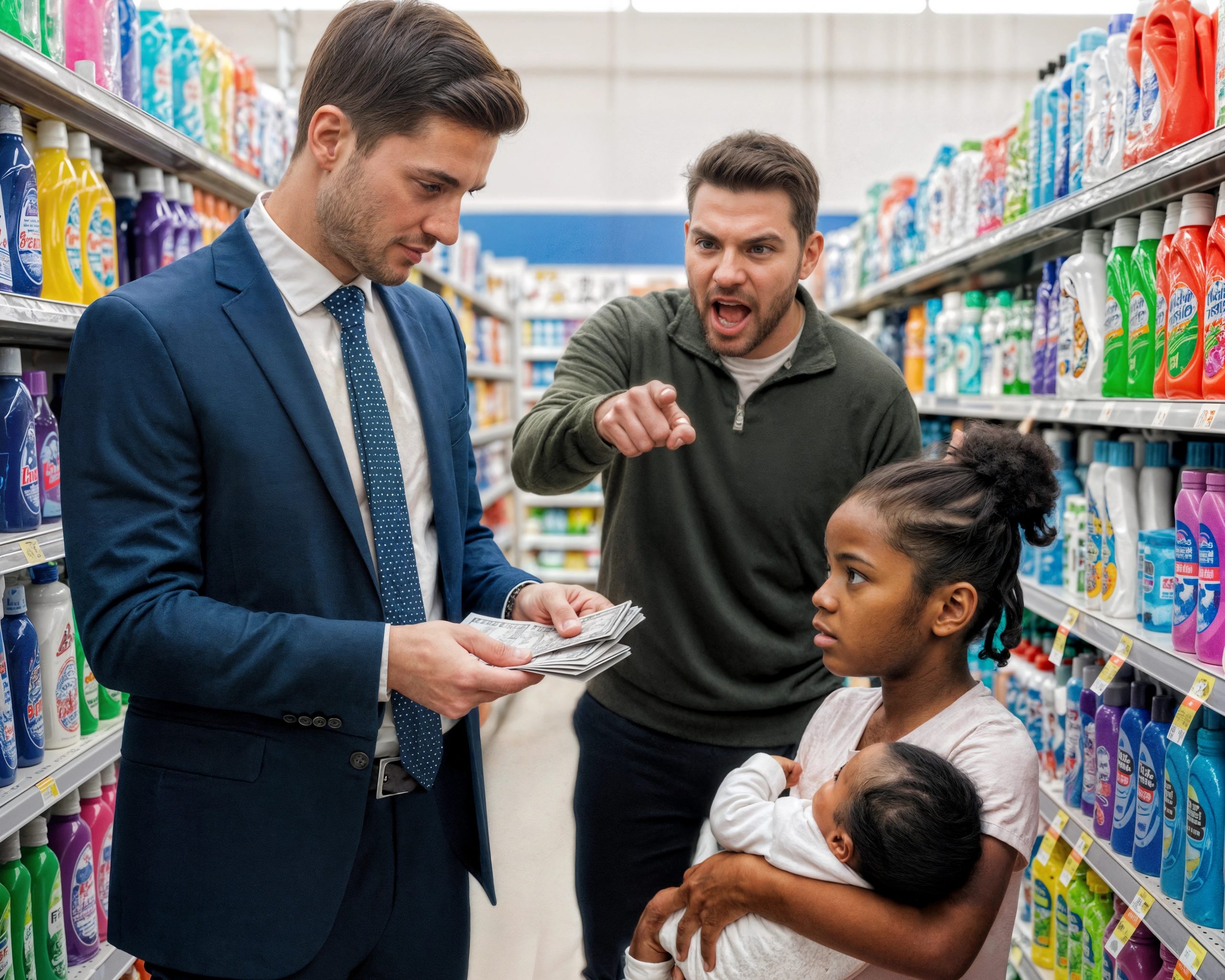 Ces mots venaient d’une fillette debout au milieu d’une allée bondée d’un supermarché. Sa chemise était déchirée, ses chaussures dépareillées, et dans ses bras maigres elle serrait à la fois un bébé et une brique de lait. Elle n’avait pas plus de neuf ans, pourtant sa voix avait la fermeté de quelqu’un qui avait vécu bien au-delà de son âge.