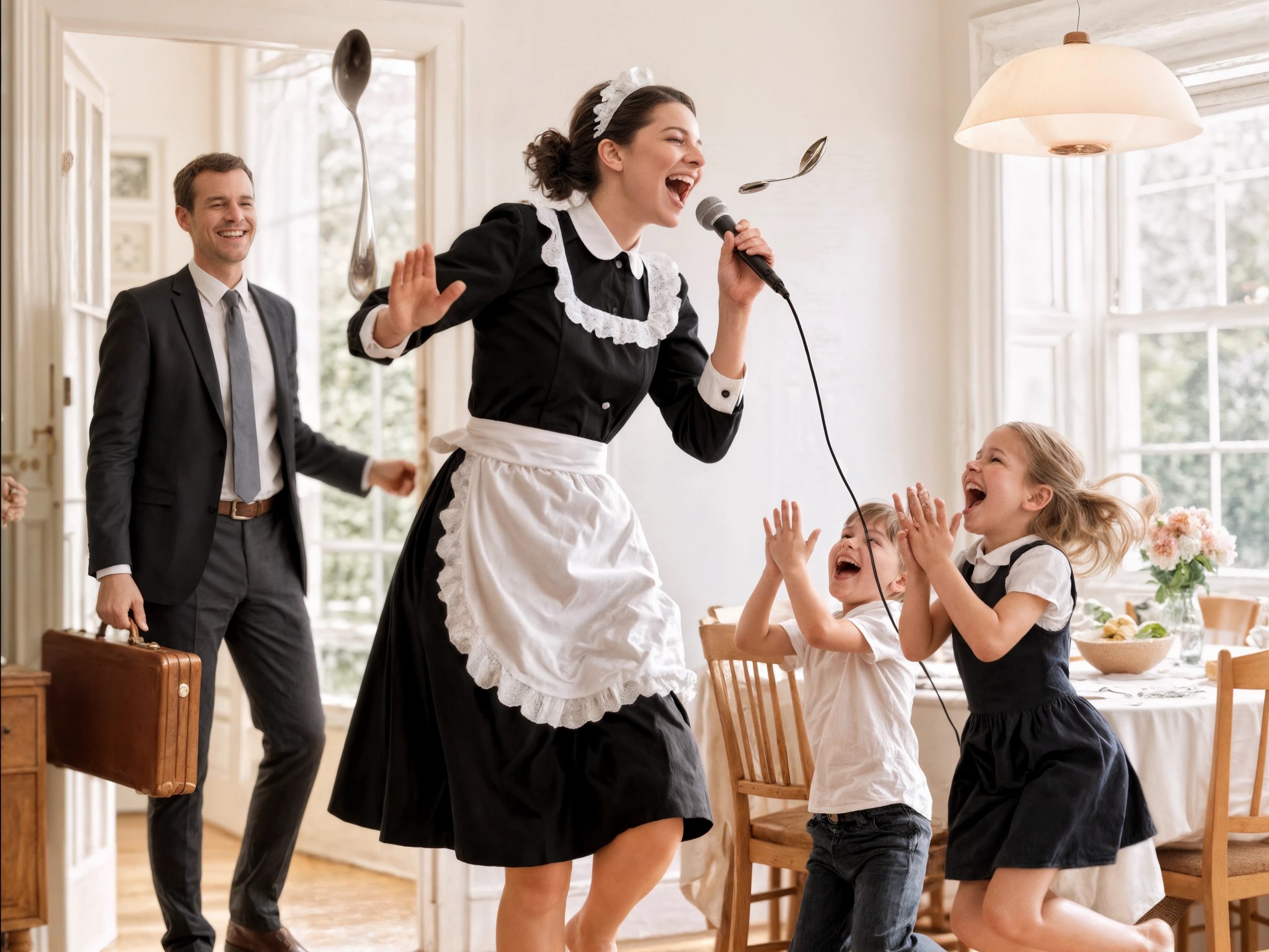Ethan et Lily riaient à nouveau, cette fois en apprenant à Rosa une danse farfelue apprise à l’école. Le lustre au-dessus d’eux scintillait d’une lumière dorée, la pièce résonnait de joie, et le cœur d’Adrian se remplit d’un bonheur qu’il n’avait jamais connu.