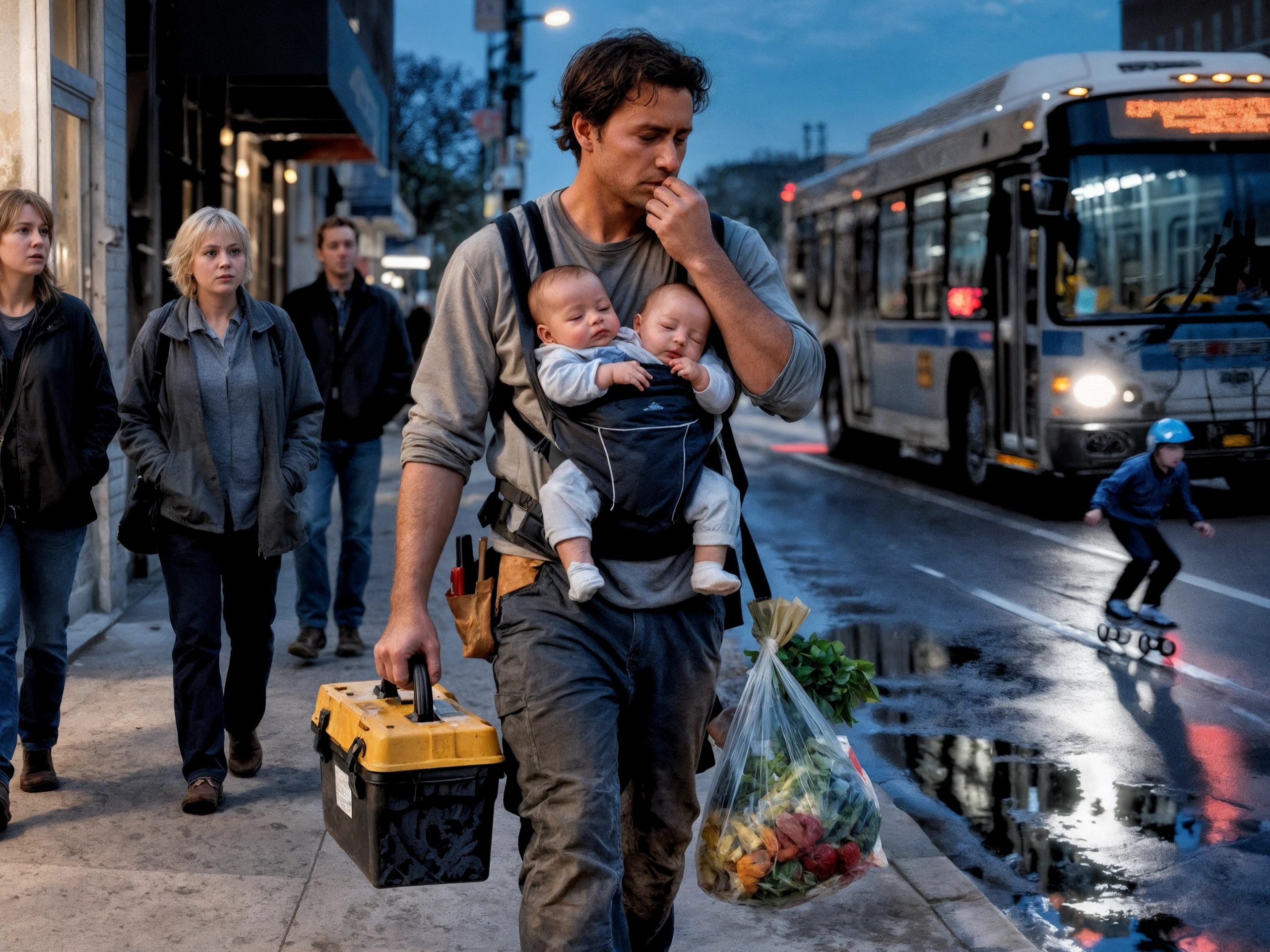 Ce n’était qu’un père vidé par la journée, avançant lentement sur le trottoir. Dans une main, il serrait sa vieille boîte à outils ; dans l’autre, les sacs de courses qui lui coupaient les doigts. Contre son torse, attachés dans un porte-bébé, deux tout-petits dormaient paisiblement. Leur mère était partie sans un mot, et depuis, il faisait de son mieux pour tout porter — le poids du quotidien, et celui de ses enfants.
