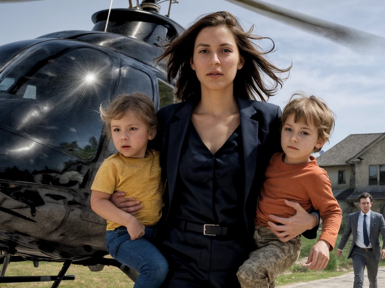 Le bruit des pales coupa net les conversations. Les invités levèrent la tête, intrigués. L’appareil se posa, la porte s’ouvrit. Emily descendit la première, impeccable dans son tailleur. Les jumeaux lui tenaient chacun une main. Derrière eux, son assistante suivait, accompagnée d’une petite équipe vidéo : on tournait un documentaire sur les femmes chefs d’entreprise parties de rien.