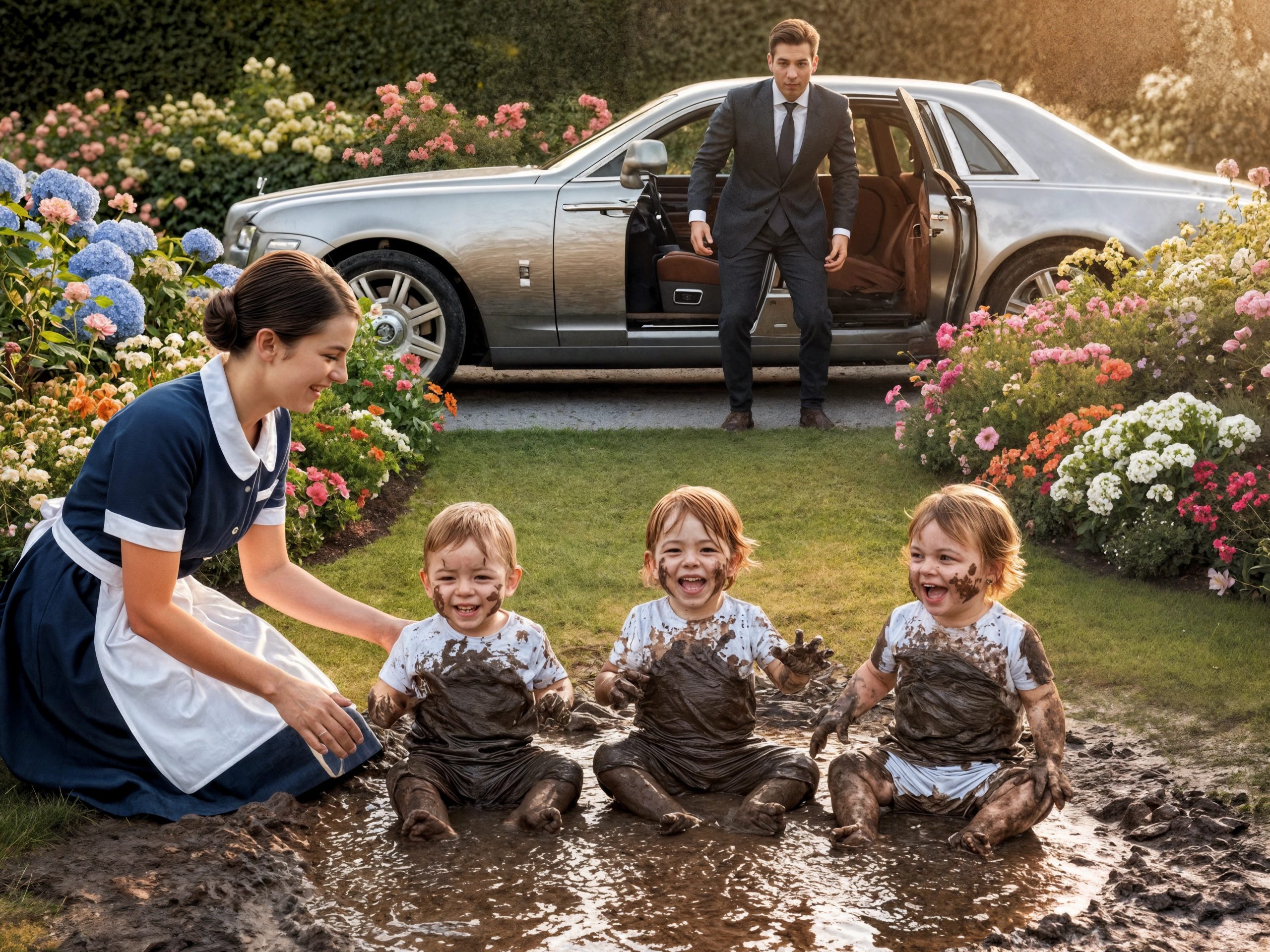 Ce n’était pas un rire mondain de réception, mais un rire plein, rond, chargé d’air. Il leva les yeux — et le monde changea. Trois enfants, couverts de boue, fêtaient leur victoire dans une flaque brune, éclaboussant la pelouse parfaite. À côté d’eux, à genoux, la nounou en uniforme bleu et tablier blanc souriait comme si elle assistait à un miracle.