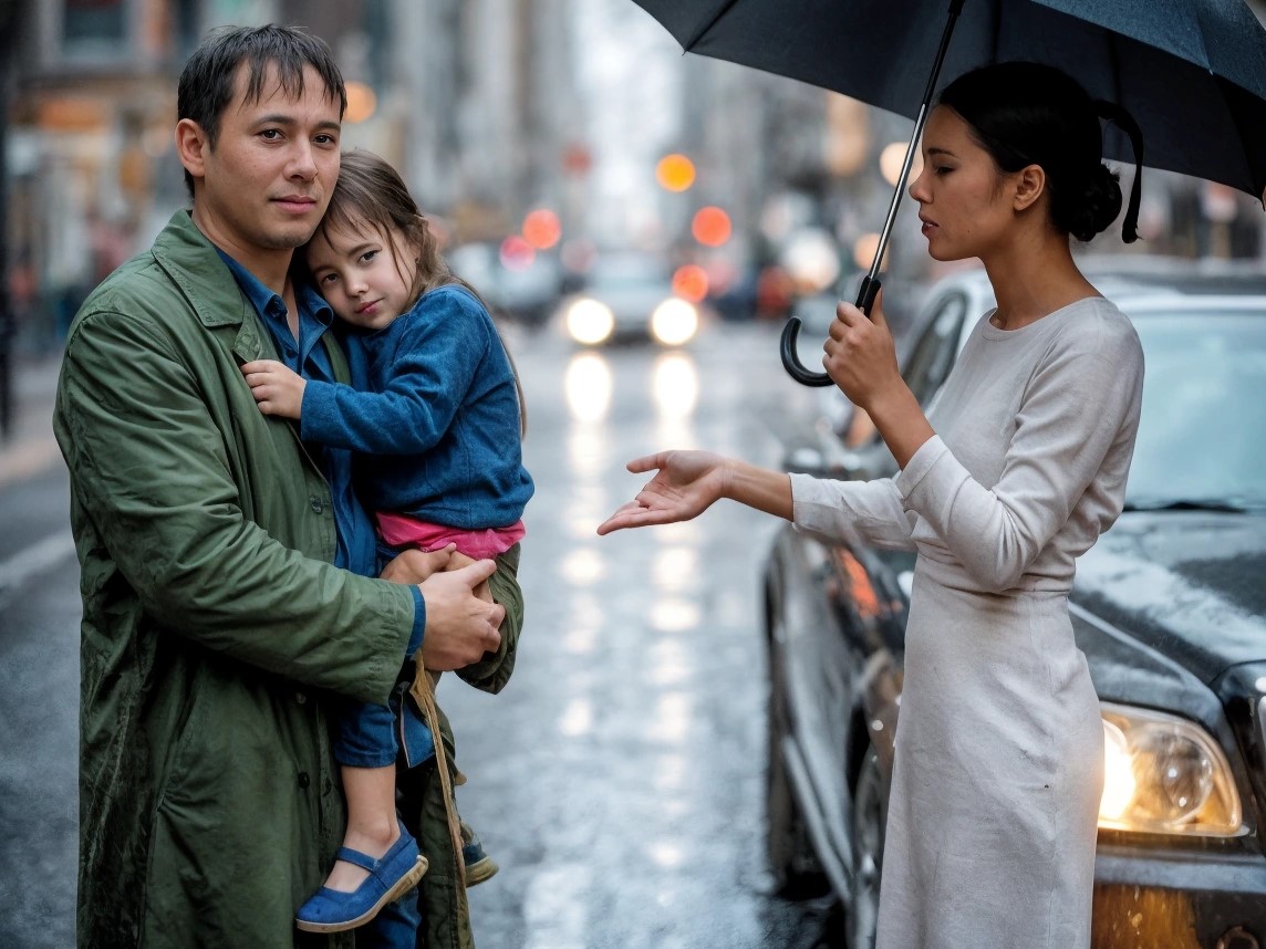 Puis une Tesla noire, impeccable, s’est engagée sur le parking. Une femme en est sortie : la trentaine, élégante, maîtrisée, presque intimidante. Son manteau bleu était simple, mais tout dans sa posture respirait l’aisance et l’habitude du luxe. Au lieu de se diriger vers la boutique, elle vint droit vers lui.
