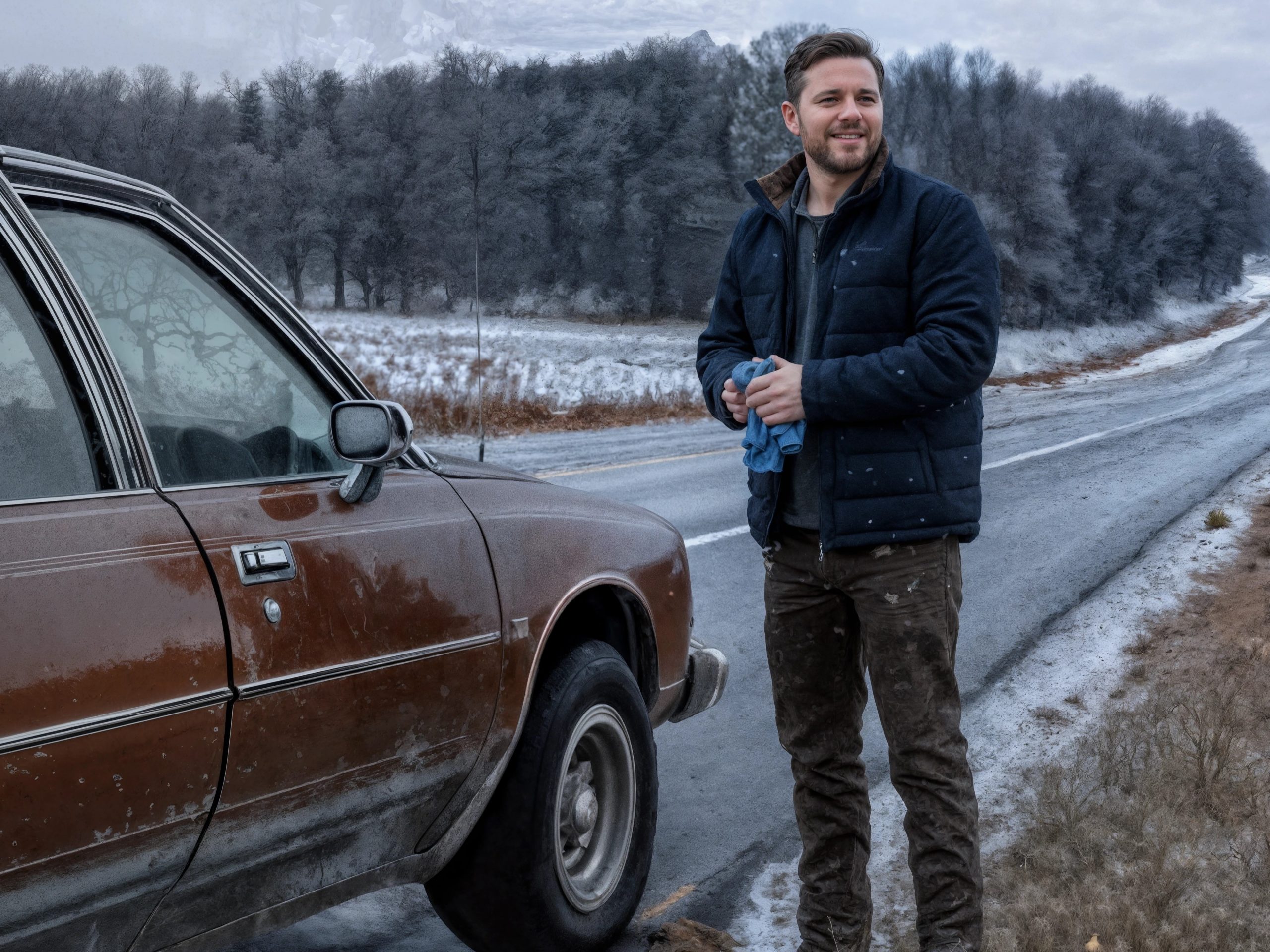 La voiture avait l’air d’avoir traversé au moins une douzaine d’hivers de trop. À côté, debout, il y avait un couple âgé, emmitouflé dans des manteaux trop fins que le vent traversait comme si de rien n’était.