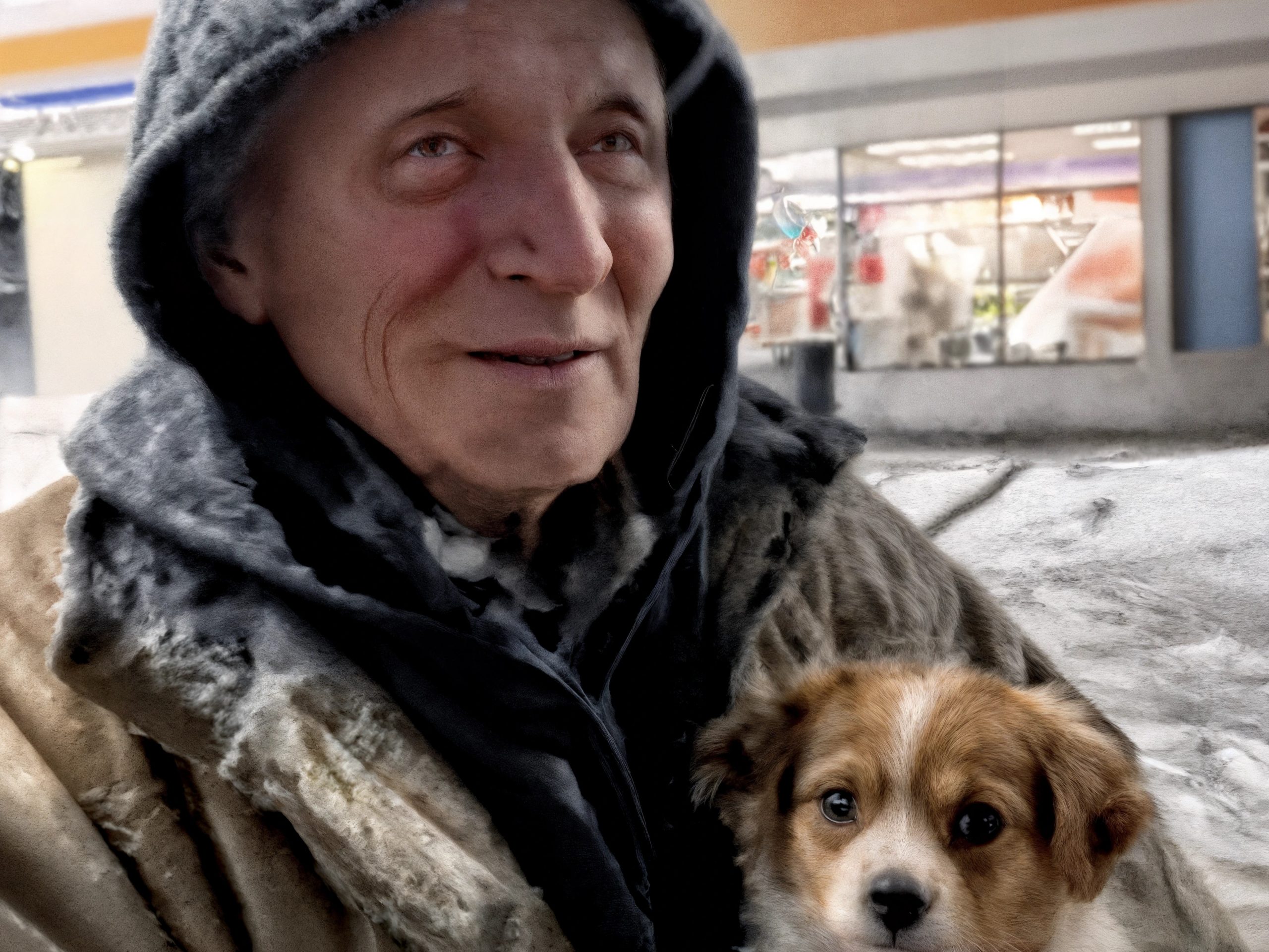 À l’autre bout du parking, près du rangement des chariots, un homme était recroquevillé sous un manteau usé. La neige s’était déposée tout autour de lui. À ses côtés, une petite chienne blanche et marron reposait la tête sur son genou. Elle n’aboyait pas, ne gémissait pas.