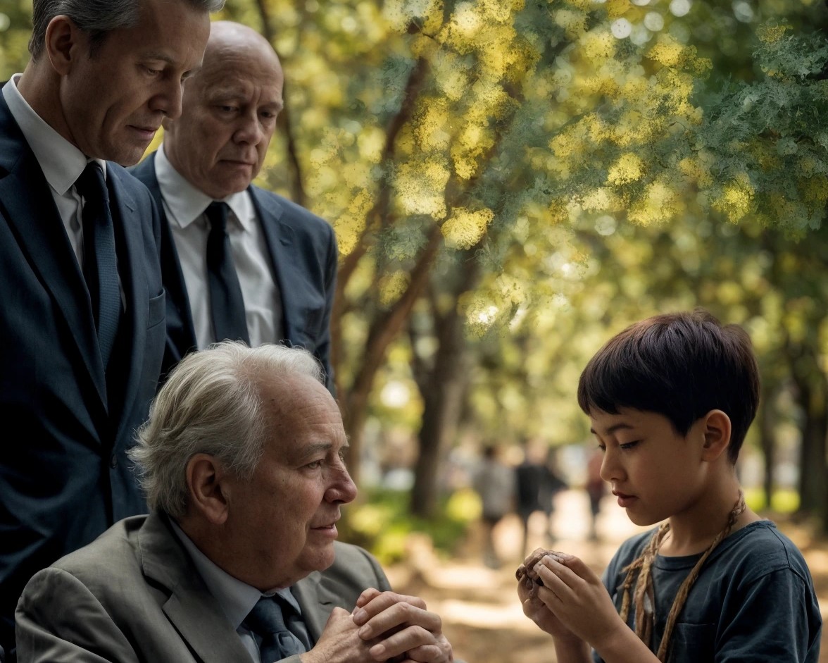 Luke s’accroupit et sortit de son sac une simple boîte à chaussures. À l’intérieur : des rubans dépareillés, un petit caillou, une vieille photo cornée. Il disposa les objets sur l’herbe avec une précision méthodique, murmura quelques mots inaudibles, puis fit des gestes lents, presque solennels.