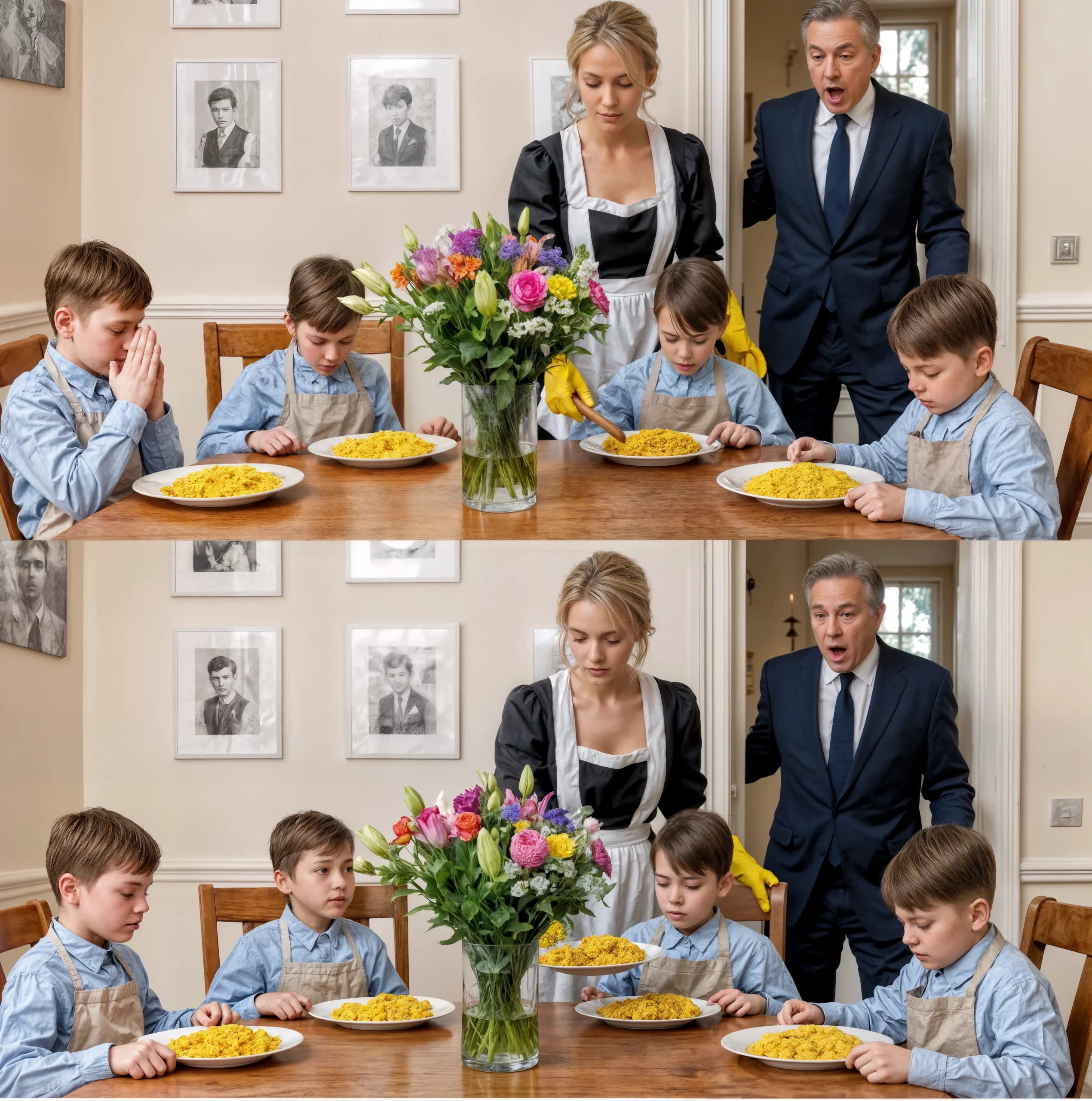 À la grande table en acajou, qu’on n’avait plus utilisée depuis les funérailles de sa femme cinq ans plus tôt, étaient assis Elena, la jeune domestique de vingt ans, et quatre enfants identiques. Quatre petits garçons d’environ quatre ans, maigres, vêtus de chemisettes taillées dans d’anciens vêtements d’Alejandro et de tabliers improvisés. Ils étaient comme quatre gouttes d’eau : mêmes yeux bleus, même sourire, jusqu’à cette élégance naturelle dans leurs gestes. Elena les nourrissait avec un simple riz jaune, les appelant doucement « mes petits oiseaux » et partageant la nourriture en portions exactement égales.