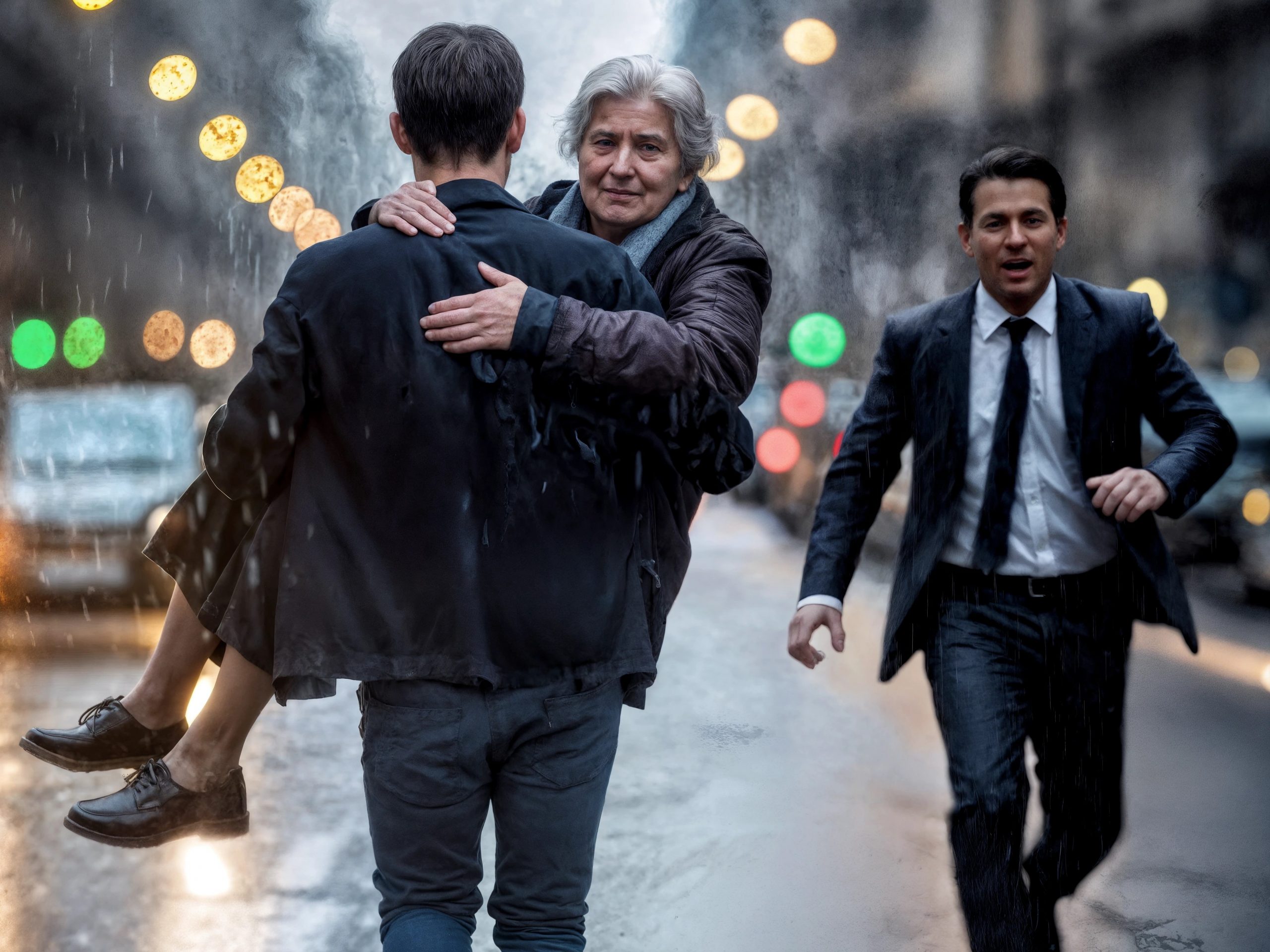 Avec un effort, il la souleva. La vieille dame était légère, mais les vêtements mouillés et le sol glissant rendaient chaque pas plus difficile. Luis sentait ses semelles déraper sur l’asphalte, la pluie lui fouetter le dos, son CV battre contre sa hanche. La vieille s’agrippait fermement à sa chemise.
