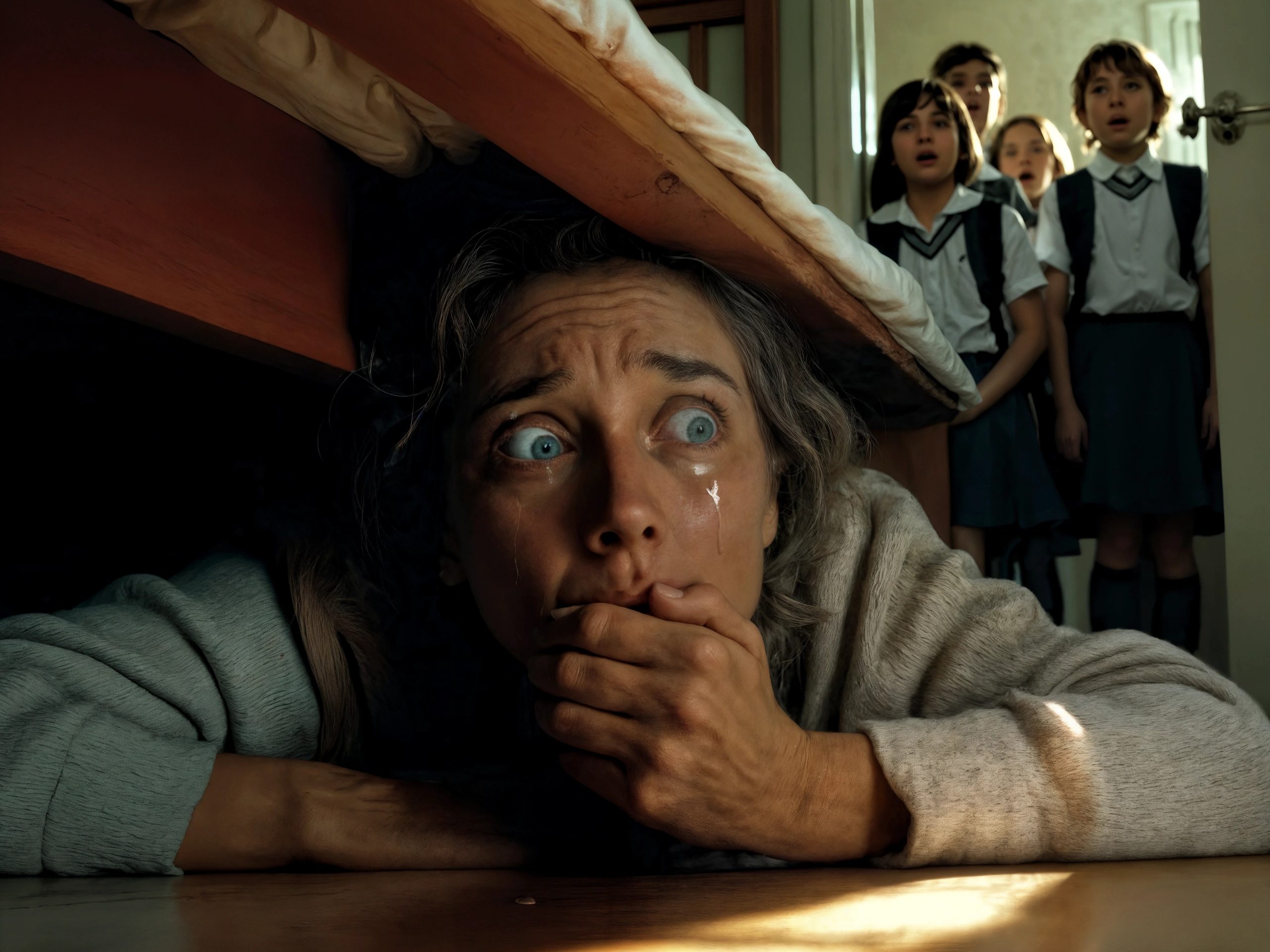 Je suis restée sous le lit, presque sans respirer, tandis que les pas traversaient le couloir. Des voix d’enfants — trois, peut-être quatre. Mon cœur cognait contre le tapis.