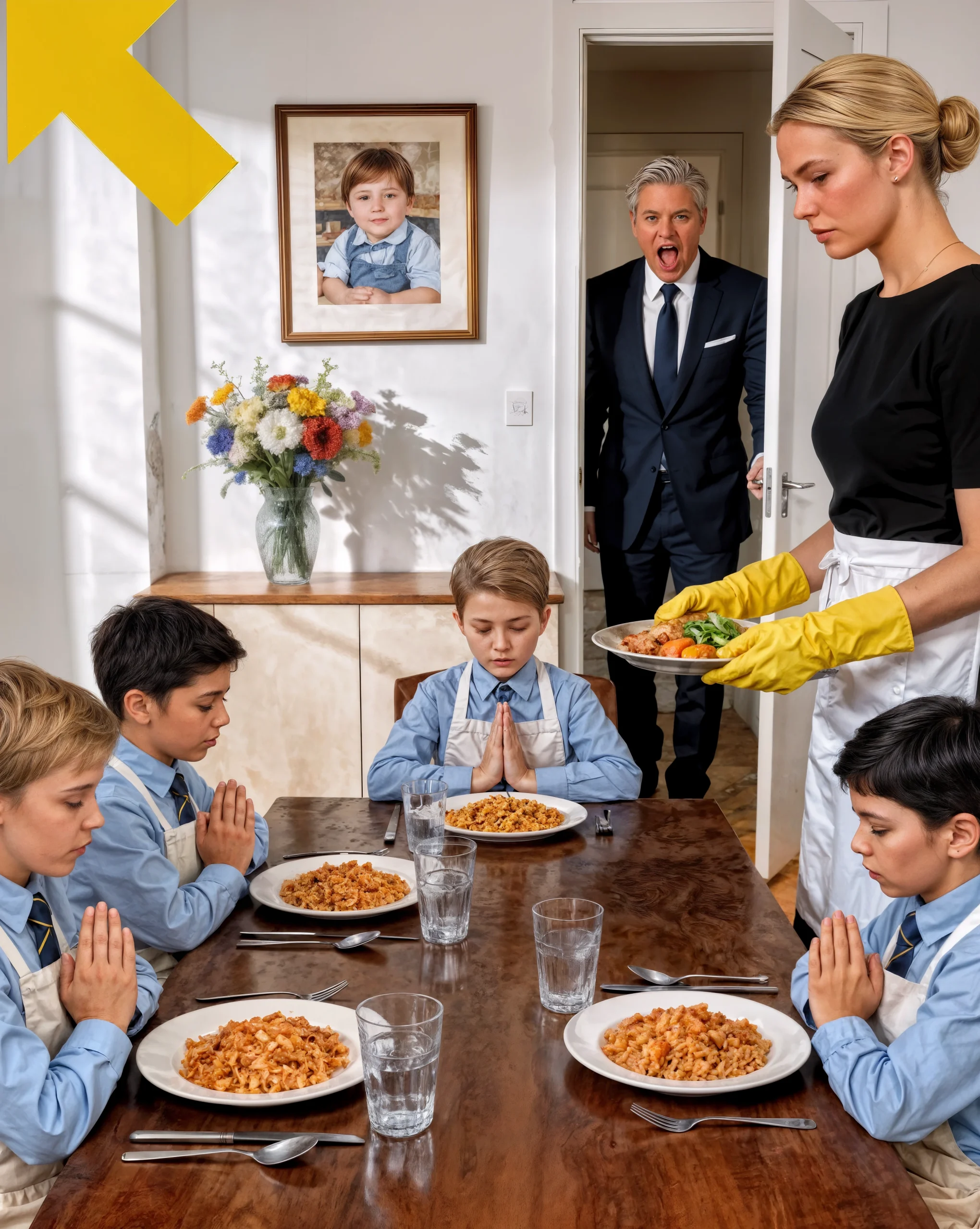 Elena, la jeune domestique à l’uniforme bleu ciel et blanc impeccable, n’était ni en train de faire briller l’argenterie, ni de dépoussiérer. Elle était assise à cette table-là, et nourrissait calmement quatre enfants identiques — environ quatre ans — vêtus de habits rapiécés, assemblés avec ce qu’on avait pu trouver.