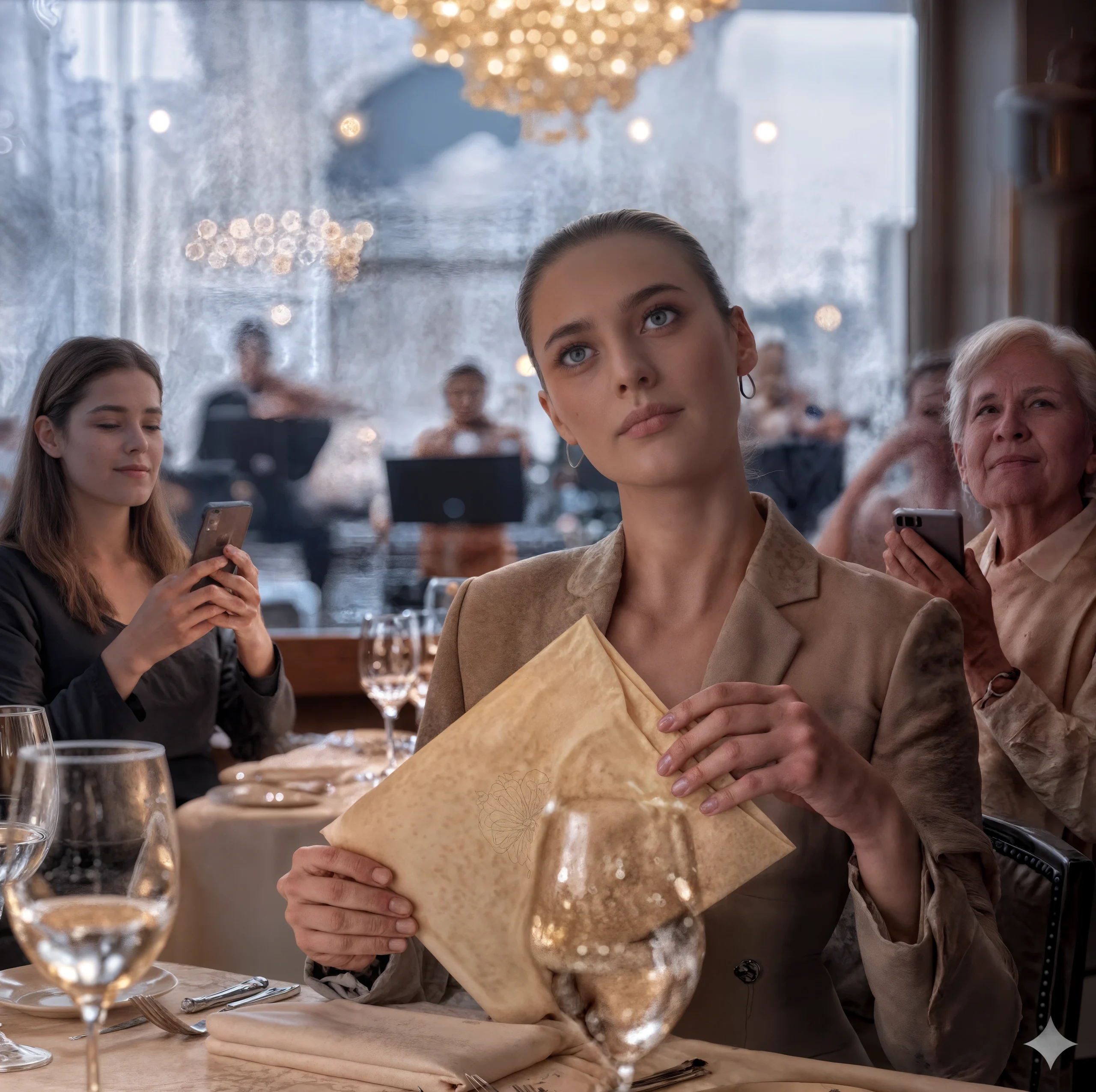 Cette enveloppe a tout changé. Ma mère la fit glisser sur le lin; sa bague en diamants accrocha la lumière d’un éclat froid, dur. Ma sœur se pencha, téléphone prêt, le petit point rouge de l’enregistrement clignotant, comme si c’était un moment à garder pour la mémoire — et non des munitions. Le restaurant se figea autour de nous… ou peut-être était-ce moi qui n’entendais plus le bruit de fond. Le quatuor hésita au milieu d’une note.