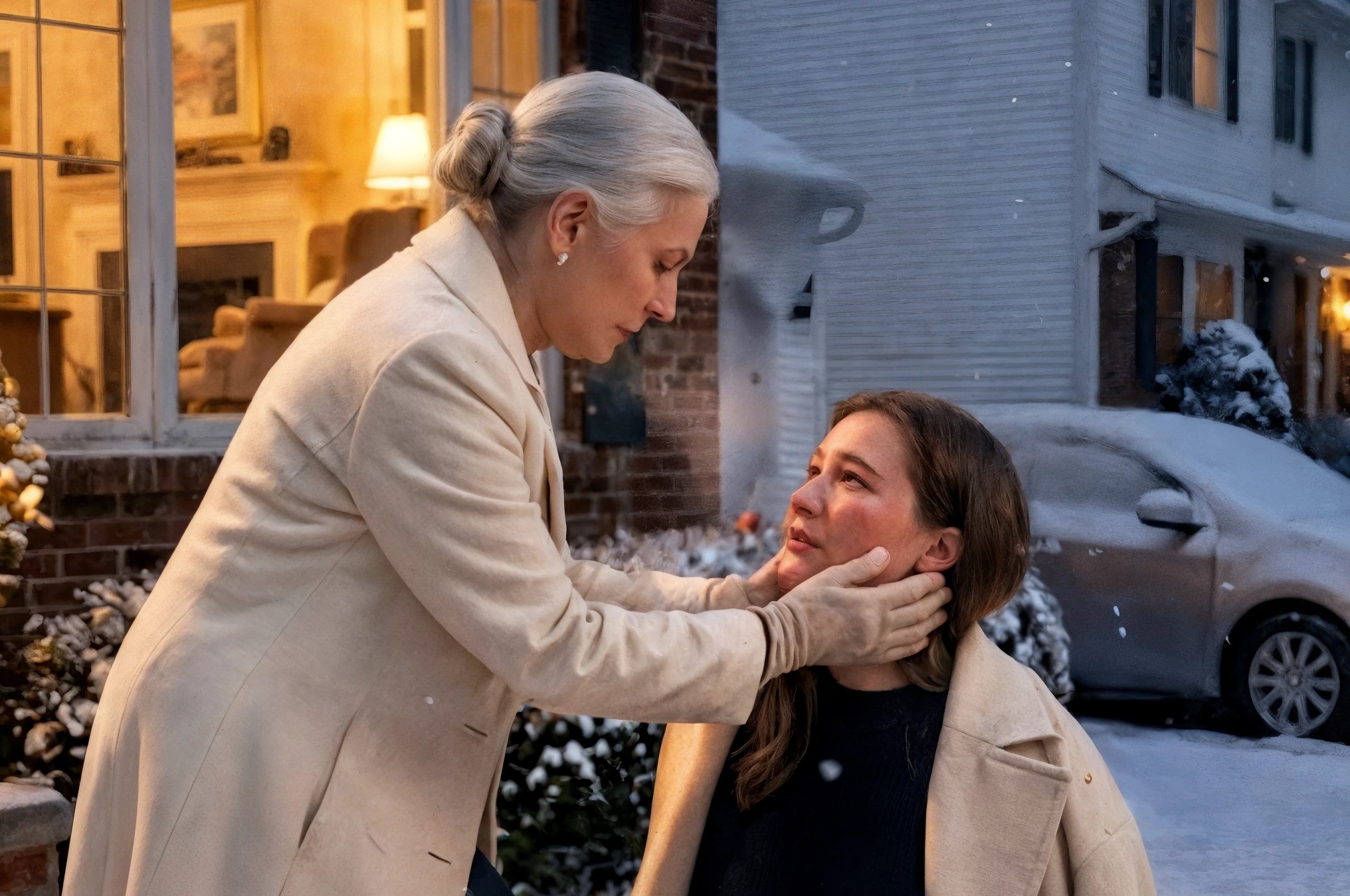 Elle m’a vue — grelottante, les lèvres bleues, brisée — et la douleur protectrice qui a traversé son visage aurait pu faire fondre la glace du perron. Elle a couru vers moi, a déboutonné son manteau et m’a enveloppée de chaleur.