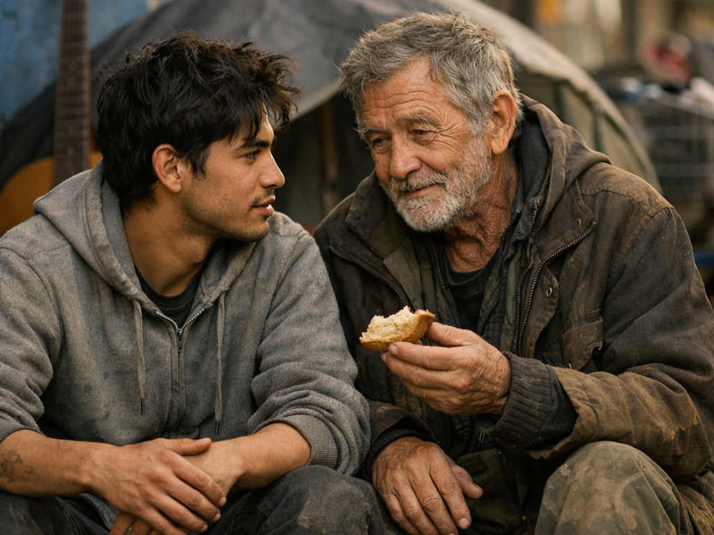 Un vieil homme en vêtements usés allait de personne en personne, demandant doucement si quelqu’un avait à manger.